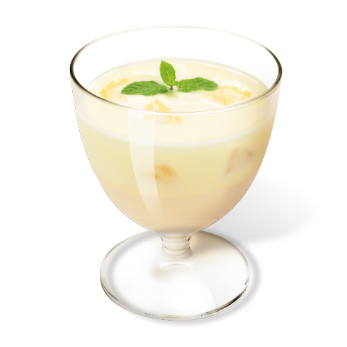 オレンジの果実入りのパインヨーグルトを甘くなめらかなホワイトチョコムースに重ねた2層仕立てのヨーグルトデザートです。